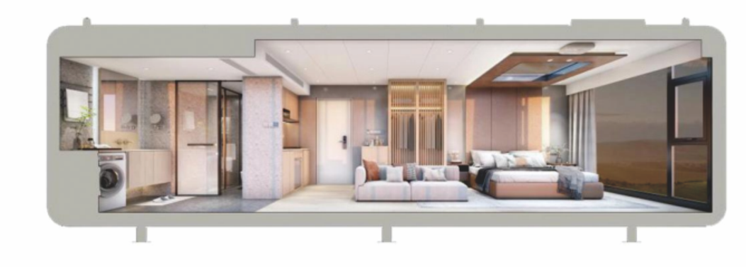 2 | Interior Structure | Eco-friendly integrated ceiling and walls with high-end finishes, plastic wood flooring, privacy glass bathroom door, and comprehensive water and electrical systems for full functionality. |