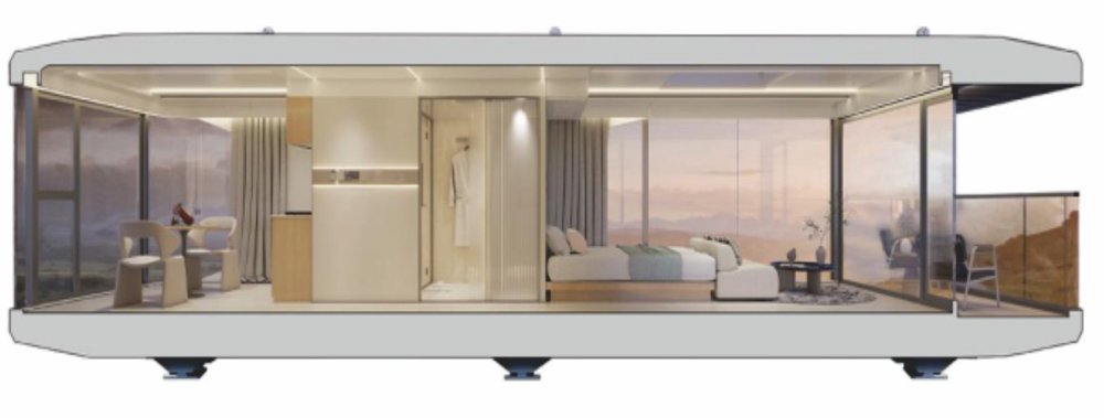 1 | Main Structure | Robust galvanized steel frame (2-3mm thick) with a fluorocarbon-coated aluminum shell (2mm thick), 80-100mm polyurethane insulation, and triple-pane hollow tempered glass for efficiency. Features include a custom entrance door with a smart lock and ambient lighting strips. |