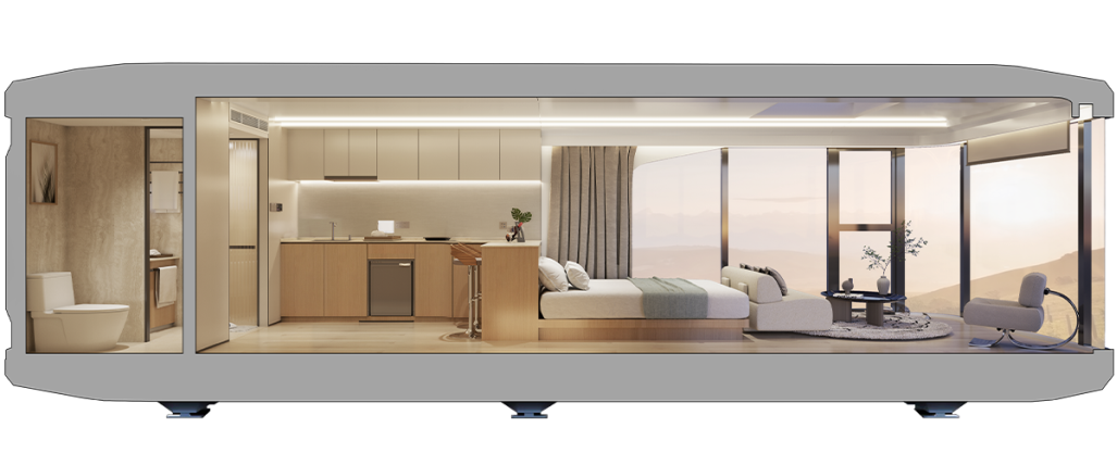 2 | Interior Structure | Eco-friendly integrated ceiling and walls with high-end finishes, plastic wood flooring, privacy glass bathroom door, and comprehensive water and electrical systems for full functionality. |