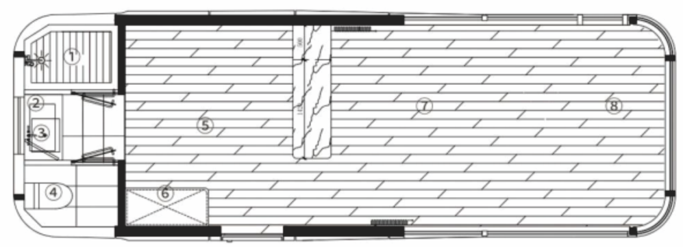 5 | Optional Features | Optional electric pipe heating, mini induction cooker with range hood, mini fridge, custom storage cabinets, and an entrance staircase for enhanced functionality and style. |