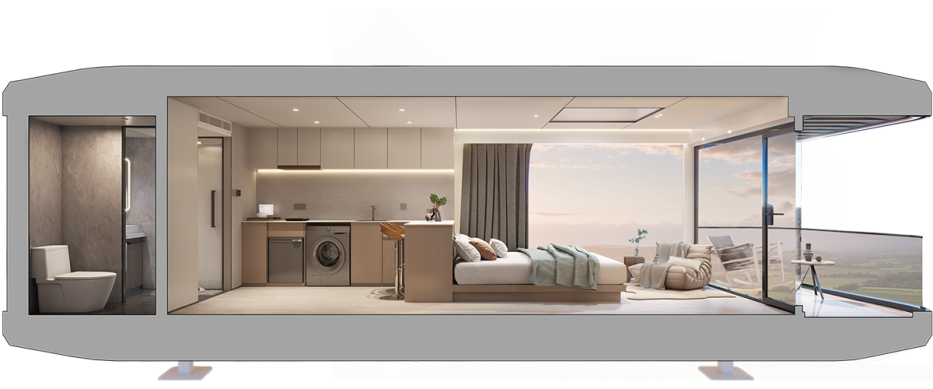1 | Main Structure | Robust galvanized steel frame (2-3mm thick) with a fluorocarbon-coated aluminum shell (2mm thick), 80-100mm polyurethane insulation, and triple-pane hollow tempered glass for efficiency. Features include a custom entrance door with a smart lock and ambient lighting strips. |
